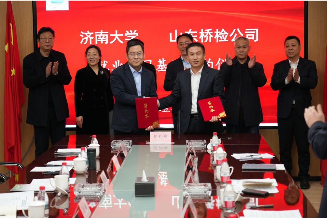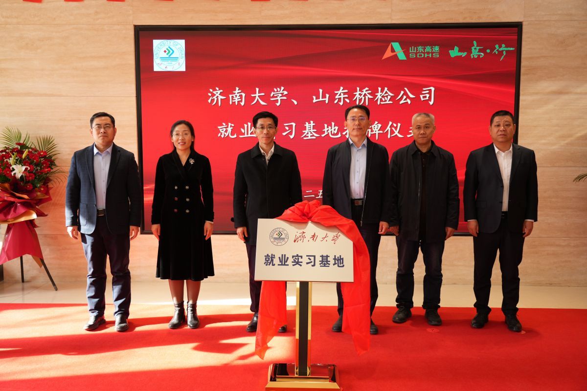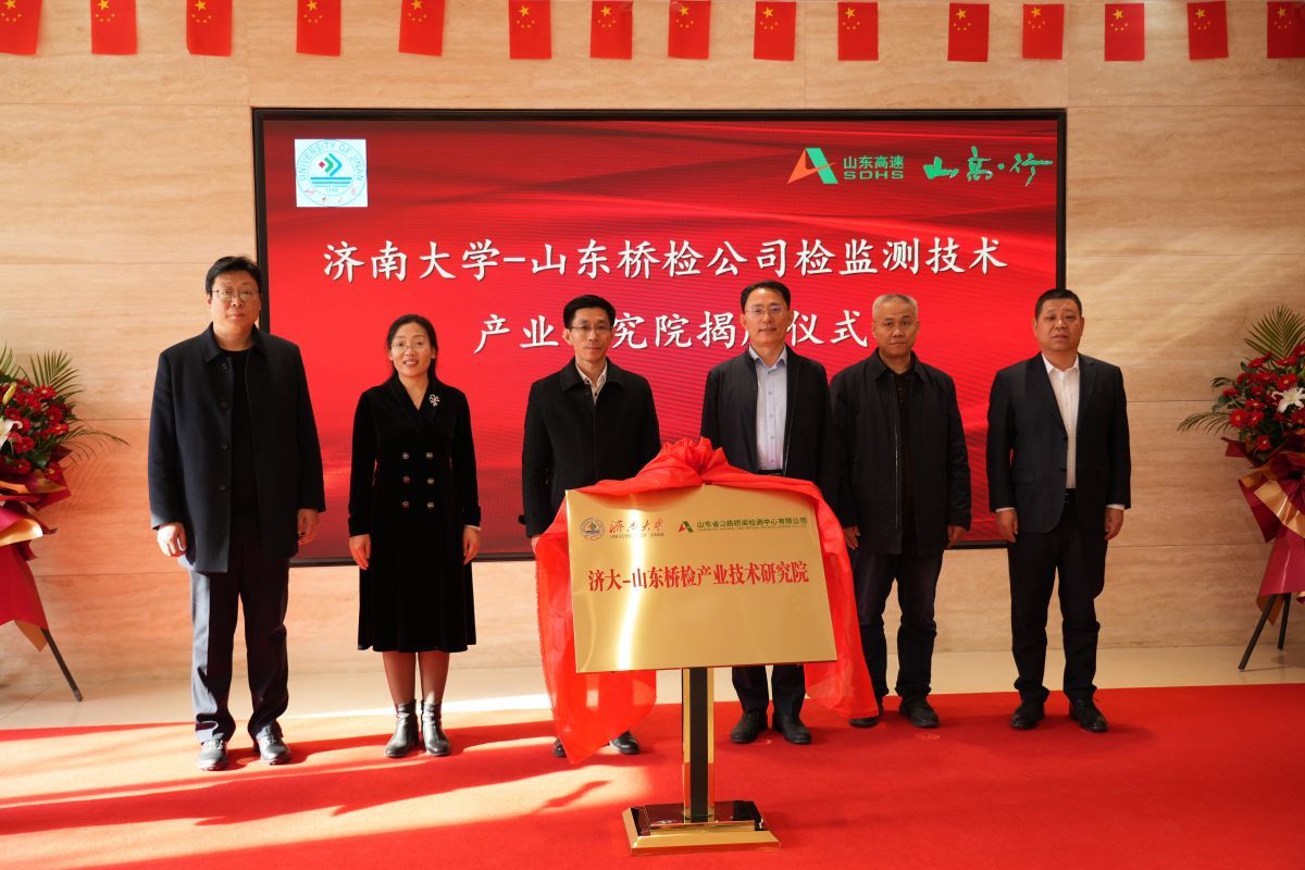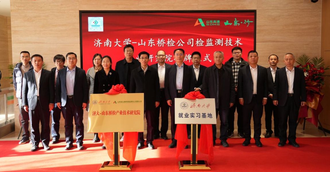 2月13日下午,sunbet申搏官方网站与山东省公路桥梁检测中心有限公司共建的“检监测技术产业研究院”与“sunbet申搏官方网站就业实习基地”揭牌仪式在山东高速工程咨询集团有限公司举行。sunbet申搏官方网站党委常委、副校长李强,山东高速集团党委常委、副总经理李怀峰,山东高速工程咨询集团有限公司党委书记、董事长张平,山东省交通运输厅工程建设事务中心质量部部长孙吉勇,山东省公路桥梁检测中心有限公司党支部书记、董事长高庆水出席仪式。学校科技处、土木建筑学院以及企业相关部门负责人参加活动。仪式由山东高速工程咨询集团有限公司党委委员、副总经理单煜辉主持。