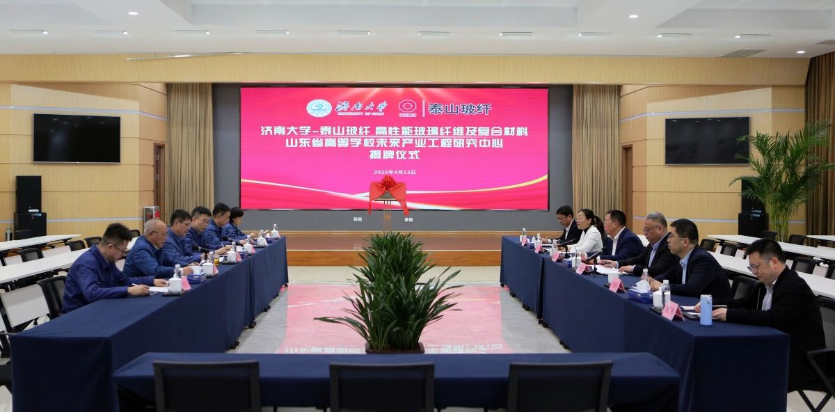 4月12日,“高性能玻璃纤维及复合材料山东省高等学校未来产业工程研究中心”揭牌仪式在泰山玻璃纤维有限公司(以下简称泰山玻纤)会议室举行。泰山玻纤党委书记、董事长呼跃武,党委副书记、总经理刘利锋及企业全体高层领导,sunbet申搏官方网站党委副书记、校长刘宗明,党委常委、副校长黄加栋,科技处、材料科学与工程学院主要负责同志参加仪式,仪式由泰山玻纤党委副书记吴龙主持。