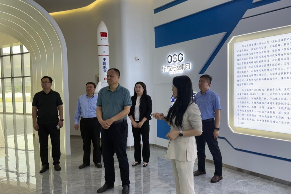 当日下午,团队来到东方光源集团有限公司进行走访调研。在东方光源集团创智园区,团队一行参观光纤通信产品展厅,公司负责人重点介绍了企业在5G新基建、海洋光缆等领域的突破。张庆国指出,学校的科研优势可与企业技术攻关形成互补,建议校企双方在当前合作的基础上,共建联合实验室推动成果转化。