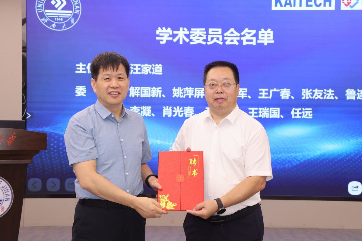 会上,刘宗明和汪家道教授共同为重点实验室揭牌。刘宗明为重点实验室学术委员会主任、理事会成员颁发聘书。汪家道教授为学术委员会委员清华大学解国新教授、中南大学姚萍屏教授、哈尔滨工业大学张广军教授、山东大学王广春教授、东南大学张友法教授、西南交通大学鲁连涛研究员、杭州电子科技大学李凝教授、齐鲁工业大学肖光春教授、sunbet申搏官方网站王守仁教授、山东开泰抛丸机械股份有限公司王瑞国教授级高工、山东产研强远激光科技有限公司任远副研究员颁发聘书。