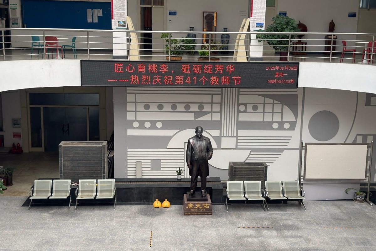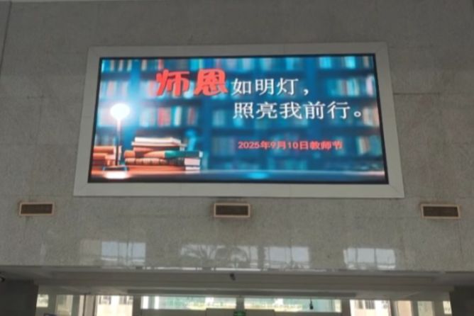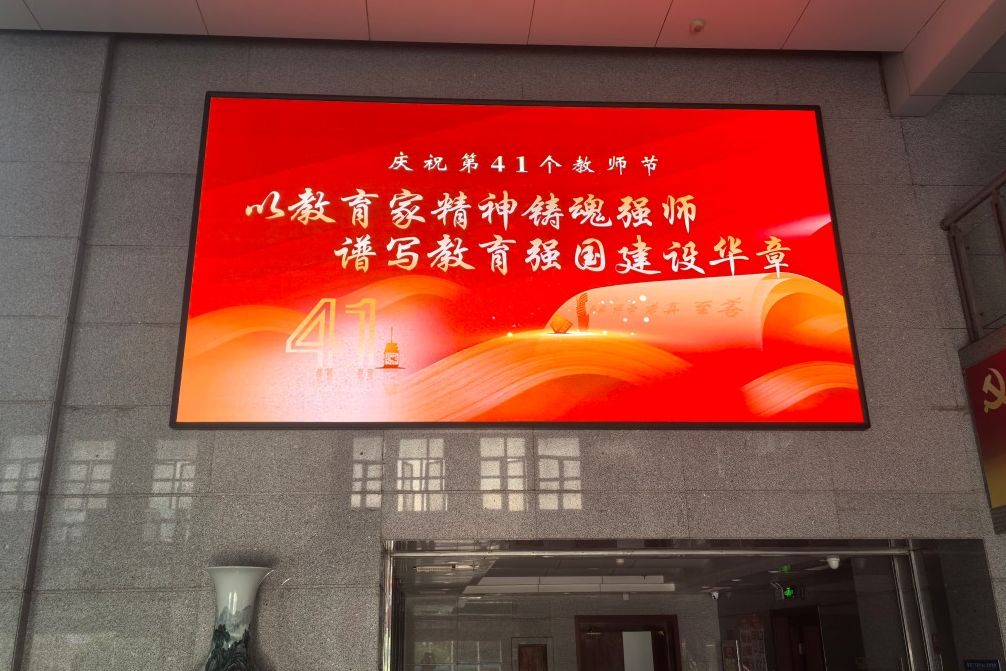 在行政楼、教学楼、图书馆、宣传栏的电子屏上滚动播放着致敬教师的标语和画面,“教育家精神铸魂强师,谱写教育强国建设华章!”“老师,您好!”“教师节快乐!”“老师您辛苦了!”等祝福语表达出对全体教师的崇高敬意。