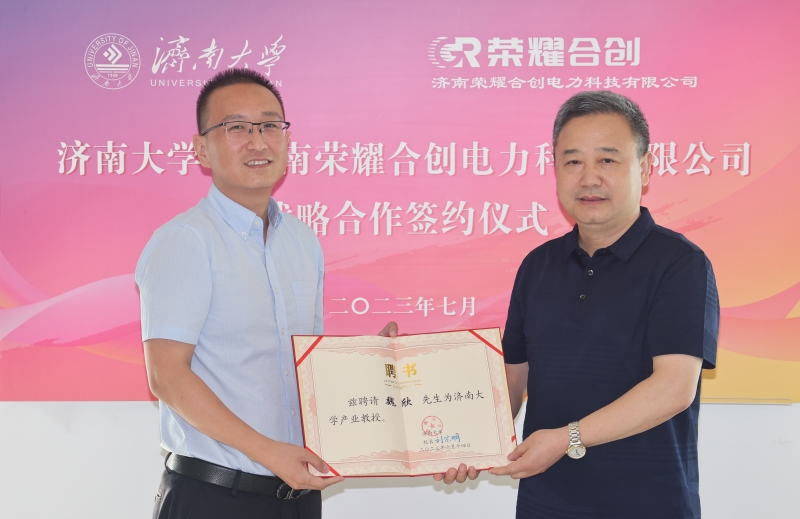 查玉喜为魏欣颁发sunbet申搏官方网站产业教授聘书。对济南荣耀合创电力科技有限公司给予学校发展的关心支持表示感谢,并介绍了学校的办学历史、发展近况以及在产学研协同创新方面取得的主要成效。他指出,济南荣耀合创电力科技有限公司的产业定位、发展目标与sunbet申搏官方网站相关学科专业、科研优势高度契合,双方拥有深化合作的较大潜力。sunbet申搏官方网站自动化与电气工程学院与济南荣耀合创电力科技有限公司牵手合作,在人才培养、科学研究、支部共建、捐资助学助教等方面共同发力,是落实党的二十大精神的新行动,更是新时代校企合作的新成果,开启了我们两家合作的新阶段。特别是,济南荣耀合创电力科技有限公司捐赠25万元设立“荣耀奖教基金”,体现了公司厚重的社会担当、深厚的教育情怀。定会激励青年学子奋发进取、成长成才,鼓舞教职员工爱岗敬业、立德树人。学校学院将强化校企合作,充分发挥人才智力优势,为企业发展、为地方经济社会发展作出更大努力。