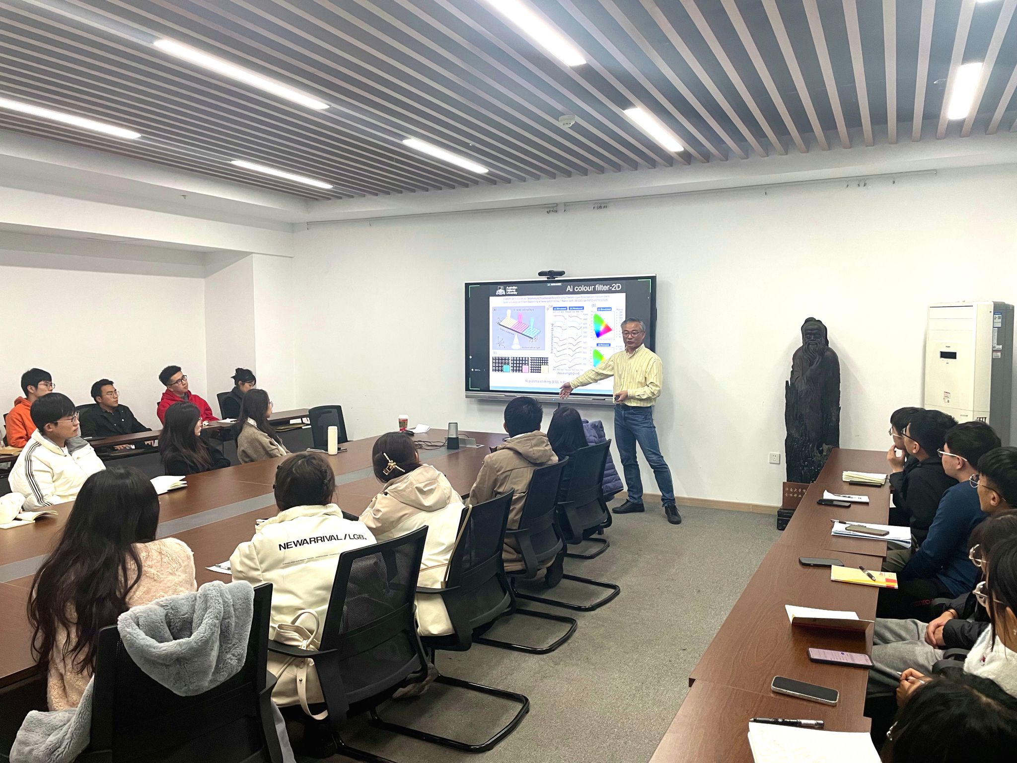 Choi教授在报告中首先详细讲解了他所熟练掌握的基于电子束光刻和原子层沉积工艺技术面向金属、半导体、介电材料在不同纳米尺度下的人工微结构制备流程,细致介绍了其中有关少层和双面纳米结构精准制备的关键技术难点,并展示了由他亲自加工制备的多种高加工精度纳米结构。基于这些纳米结构所构筑的超构器件,他与合作者开展了面向不同领域的应用探索,包括红外传感、溶液识别、信息加密、激光雷达、片上波导、量子芯片、光镊微粒操纵、结构色显示等前沿热点,超构器件多元化的应用场景引起了参会老师和同学们的极大兴趣。报告后,Choi教授认真回答了与会师生提出的问题,并就超构技术的未来发展动向以及超构器件的产业化等热点问题与在场师生进行了细致交流,并参观了集成电路制造实验室。