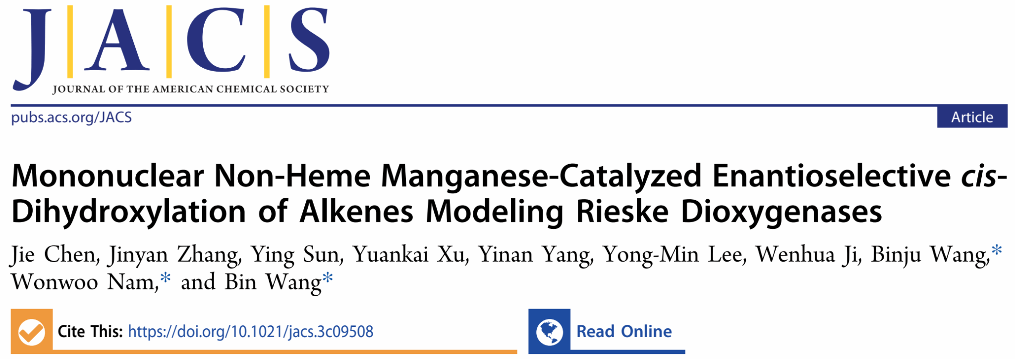 近日,sunbet申搏官方网站化学化工学院王斌教授课题组与厦门大学王斌举教授、韩国梨花女子大学Wonwoo Nam教授合作在国际化学领域权威期刊《美国化学会志》(J. Am. Chem. Soc. 2023, DOI:10.1021/jacs.3c09508.)发表了题为“Mononuclear Non-Heme Manganese-Catalyzed Enantioselective cis-Dihydroxylation of Alkenes Modeling Rieske Dioxygenases”的研究论文。