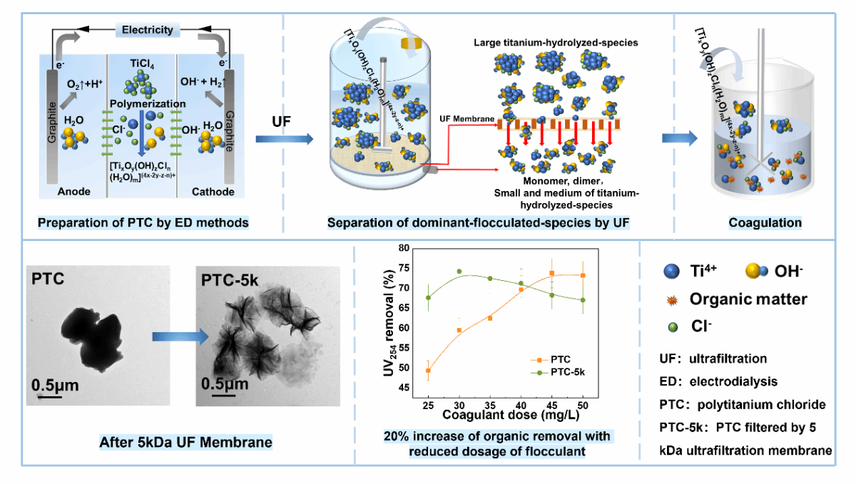 优势絮凝物种的丰度是决定混凝剂混凝性能的关键。钛基混凝剂因其混凝效率高而备受关注,但如何鉴定并分离主要絮凝物种是目前面临的一个挑战。先前我们课题组通过精确的控制钛水解物种与OH- 之间的微界面反应,利用电渗析法(ED)成功合成了富含优势絮凝物种的聚合氯化钛(PTC)。