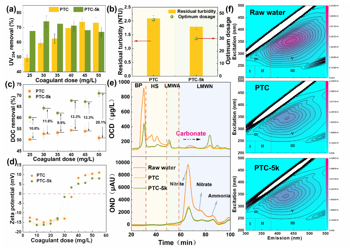混凝效果实验表明PTC-5k在去除有机污染物方面明显优于PTC。与PTC相比,PTC-5k将有机物的去除率提高了约15.0%。此外,PTC-5k被证明在降低浊度水平方面非常有效,在最佳剂量下,PTC-5k的残余浊度约为1.79 NTU, PTC-5k的DOC去除效率比PTC高10%−20%。在最佳剂量下,PTC-5k显著提高了UV254和DOC的去除率,分别提高了15%和11.6%。随后,使用SEC-OCD-OND测试讨论了PTC-5k在有机物去除方面的具体优势。 PTC-5k 的 BP去除率为54%。关于氨,通过混凝去除率约为40%。