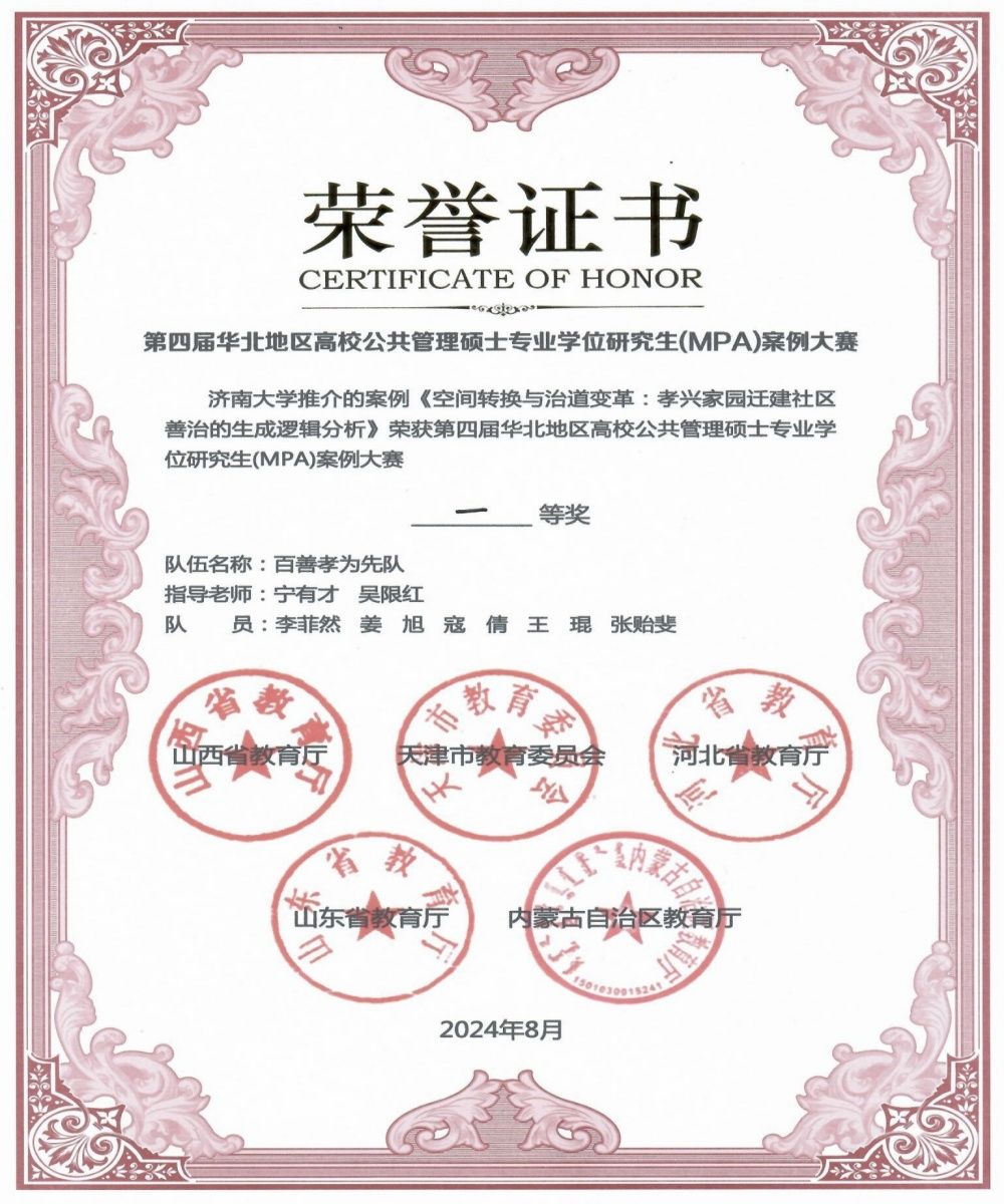 本次大赛共有来自山西、天津、山东、河北、内蒙古五个省(市、自治区)高等院校的六十支队伍参加。由我校政法学院教师宁有才、吴限红指导,公共管理学2023级研究生李菲然(队长)、公共管理(MPA)2022级研究生姜旭、王琨、寇倩、张贻斐组成的“百善孝为先”队代表sunbet申搏官方网站参赛,并提交参赛案例《空间转换与治道变革:孝兴家园迁建社区善治的生成逻辑分析》。