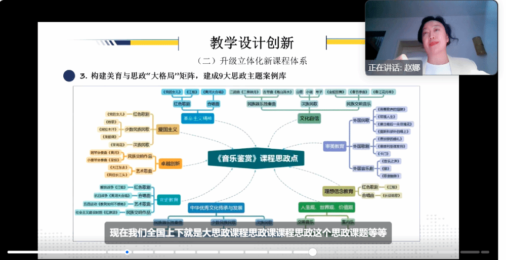 《音乐鉴赏》是赵娜副教授带领团队面向学校全体学生开设的通识课程,经过团队多年的建设与不断创新,打造成混合式教学的优秀范例课程。首先,赵娜对混合式教学从教学资源、评价机制、质量监控、个性化学习路径、技术支持等方面进行系统阐述,并概括了构建混合式教学的感受和经验。其次,以《音乐鉴赏》为教学案例,详细阐述“三环联动”教学创新设计的核心理念,即通过“课程内容创新环”“教学方法创新环”与“评价体系创新环”的紧密联动,构建起一个高效、互动、多元化的教学新生态。最后,赵娜副教授以参加全国高校混合式教学设计创新大赛的切身体会,在参赛材料的准备、参赛视频的录制及专家交流环节等方面分享经验,与会教师在教学创新能力提升方面受益匪浅。最后,音乐学院王建成副院长作总结发言,王建成代表全体教师感谢赵娜副教授带来的宝贵教学创新经验,他鼓励大家要以此次交流学习为契机,携手并进,继续深化课堂教学改革,积极探索适合新时代要求的教学方法和教学手段,共同推动音乐学院的教学事业再上新台阶。
