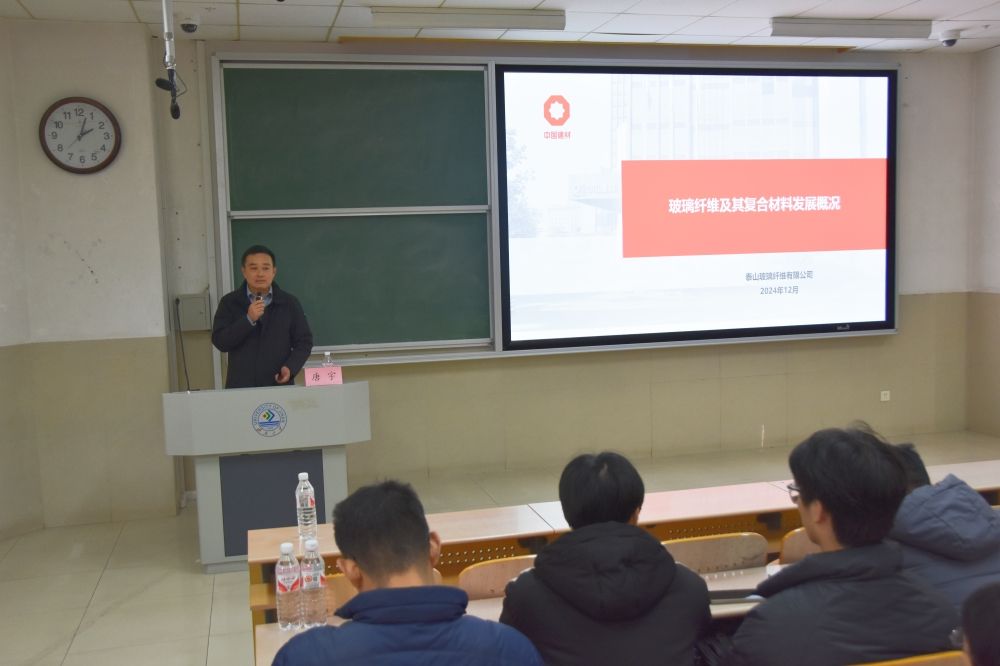 12月10日,全国高校黄大年式教师团队2024系列课程《材料创造美好未来》第八讲在sunbet申搏官方网站11J6301举行。来自泰山玻璃纤维有限公司副总经理唐宇为材料科学与工程学院师生带来了题为“玻璃纤维及其复合材料发展概况”的专题讲座。讲座由材料科学与工程学院院长赵德刚主持,300余名师生聆听了讲座,并进行了现场交流。