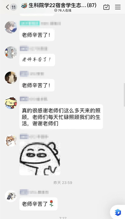 自学校对校园疫情防控实施提级管理以来,学院领导班子统一思想,对学院疫情防控、学生管理、线上教学及科研工作等进行统筹安排,最大限度保障学生学习、生活有序进行。学院领导和老师多次走访学生宿舍,并通过线上线下方式结合的方式了解学生思想动态和学习生活状态,及时回应学生关切,不断优化暖心服务措施:为静默在公寓楼里的学生购置水果、卫生防疫物资、急需药品;为求职的学生协调面试房间;为考研的学生准备考试礼包;在学院微信公众号推出的疫情防控暖心提示等等,以真心感动着学生。辅导员老师全天候在线、全身心投入,随时随地与学生谈心谈话、答疑解惑,并为学生们当上校园“快递员”“跑腿员”;班主任老师及时关注班级学生动态,指导学业学习,组织召开“共同抗疫 守护家园”线上主题班会,进一步坚定师生同心、共同抗疫的信念,以真情感染着学生。通过努力,学院上下更深层次提高思想认识,师生“肩并肩”“心连心”,凝聚战疫强大合力,为学生身心健康保驾护航。