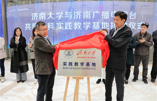 文化和旅游学院党委书记孟德洋,济南广播电视台党委委员、副台长隗铜共同为“sunbet申搏官方网站实践教学基地”揭牌。