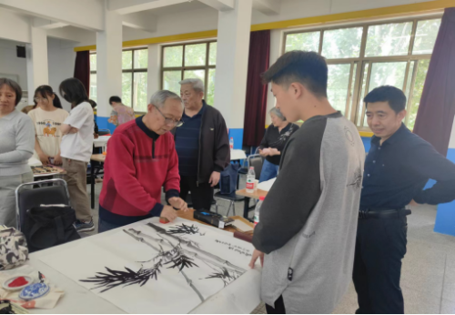 活动现场气氛热烈,老少同时挥毫,各展所长,一幅幅生动的书画作品渐渐跃然纸上,老同志的高超艺术水平和对艺术执着的追求令同学们赞叹不已,同学们也大显身手,在老同志的指导下,提笔落墨充满着自信。典雅秀丽、生动活泼各具特色的水墨作品呈现在眼前。老有所乐挥翰墨,新有所为歌盛世,老少在一起不时交流着运笔和调色技巧,现场的创作交流,进一步激发了学生学习书画的热情,为校园增添了浓浓的艺术气息。老少携手共互动、交流书画磋技艺,充分展示出新时代“五老”良好的精神风貌和高尚的思想境界,体现广大青年的爱党之心、爱国之情、报国之志。