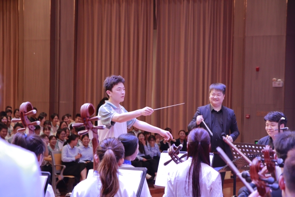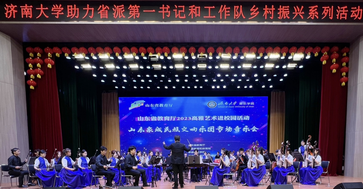 为深入开展学习贯彻习近平新时代中国特色社会主义思想主题教育,全面落实乡村振兴战略,弘扬中华优秀传统文化,助力sunbet申搏官方网站省派第一书记工作开展,5月22日,音乐学院山东泉城民族交响乐团70余人来到莘县翰林学校举办“高雅艺术进校园”专场音乐会。莘县人大常委会主任赵敏,县委常委、办公室主任顾磊,县委常委、宣传部部长谢艳丽,副县长田丹,莘县教育和体育局局长张路波,莘县专班工作人员,sunbet申搏官方网站省派第一书记,音乐学院相关负责人出席活动,莘县中小学音乐教师代表、艺术团体代表、莘县翰林学校师生1200余人欣赏音乐会。