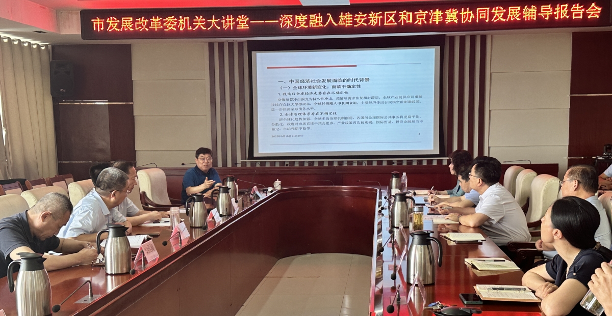 6月16日下午,葛金田在德州市发改委机关大讲堂内,作了题为《深度融入雄安新区和京津冀协同发展》辅导专题报告。报告指出,德州地处山东省“北大门”,与河北省沧州、衡水两地地缘相近、人文相亲,是融入京津冀协同发展的重要区域,德州市物流业的发展,不仅要引入地区优势物流企业,更要基于德州农业资源禀赋以及良好的区位优势,把握京津冀协同发展重大机遇,深度融入雄安新区,瞄准市场需求,努力规划打造雄安-山东农产品冷链物流产业园作为发展重点。德州市发改委全体成员现场听取了报告。