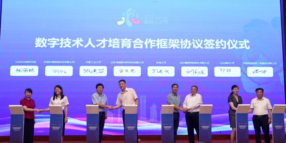产教融合谱新篇,校企合作共未来。开班仪式上,sunbet申搏官方网站继续教育学院与山东福牌阿胶股份有限公司、山东区块链研究院与济南科德智能科技有限公司、齐鲁工业大学继续教育学院与山东洪瑞新材料科技有限公司、山东建筑大学继续教育学院与济南铸诚建筑工程集团有限公司签订了数字技术人才培育合作框架协议。孙喜武院长代表学院签约。