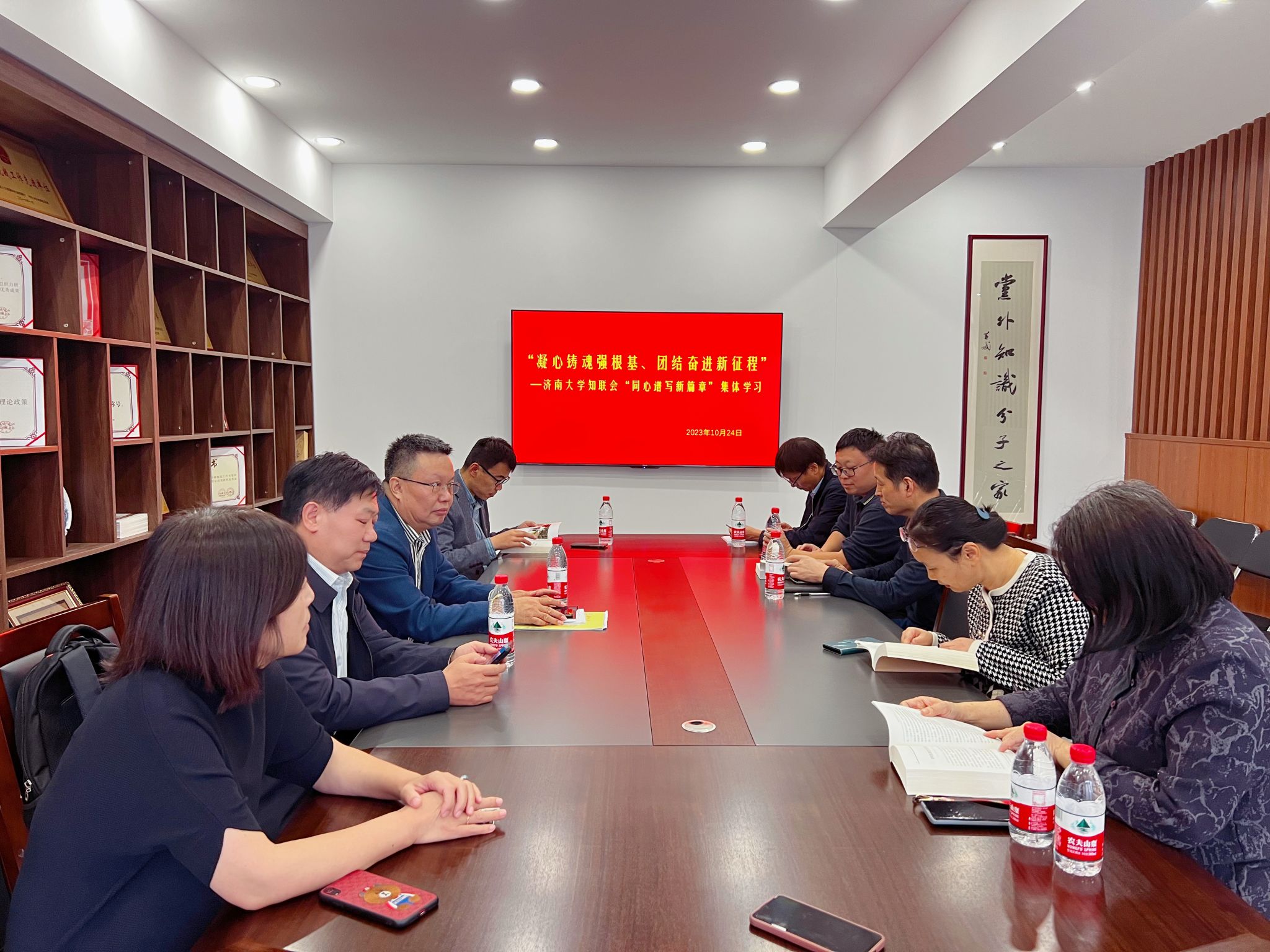 会上,与会人员集体学习了《习近平著作选读》第一卷习近平总书记关于文化建设的重要论述。大家一致认为,党的十八大以来,习近平总书记就文化建设提出了一系列新思想新观点新论断,推动我国文化事业日益繁荣兴盛。《习近平著作选读》第一卷、第二卷收录了习近平总书记关于文化建设的重要论述,为在新的起点上继续推动文化繁荣、建设文化强国、建设中华民族现代文明提供了根本遵循。大家纷纷表示,要扎实推进主题教育,认真学习《习近平著作选读》,全面系统深化对习近平新时代中国特色社会主义思想的理解,深刻把握这一重要思想的理论特质、科学体系、世界观方法论和宏大使命情怀,把学习成效转化为推动学校高质量发展的生动实践。学习期间,大家还参观了学校办学成就展,并就如何开展好主题教育,如何进一步加强无党派人士和党外知识分子工作,凝聚人心、汇聚力量不断推进学校高质量发展进行了交流研讨。