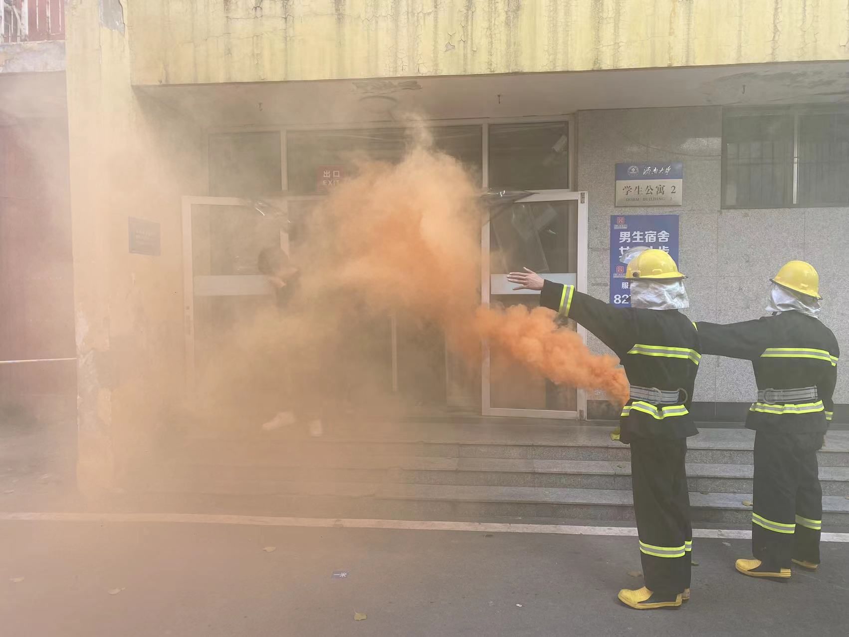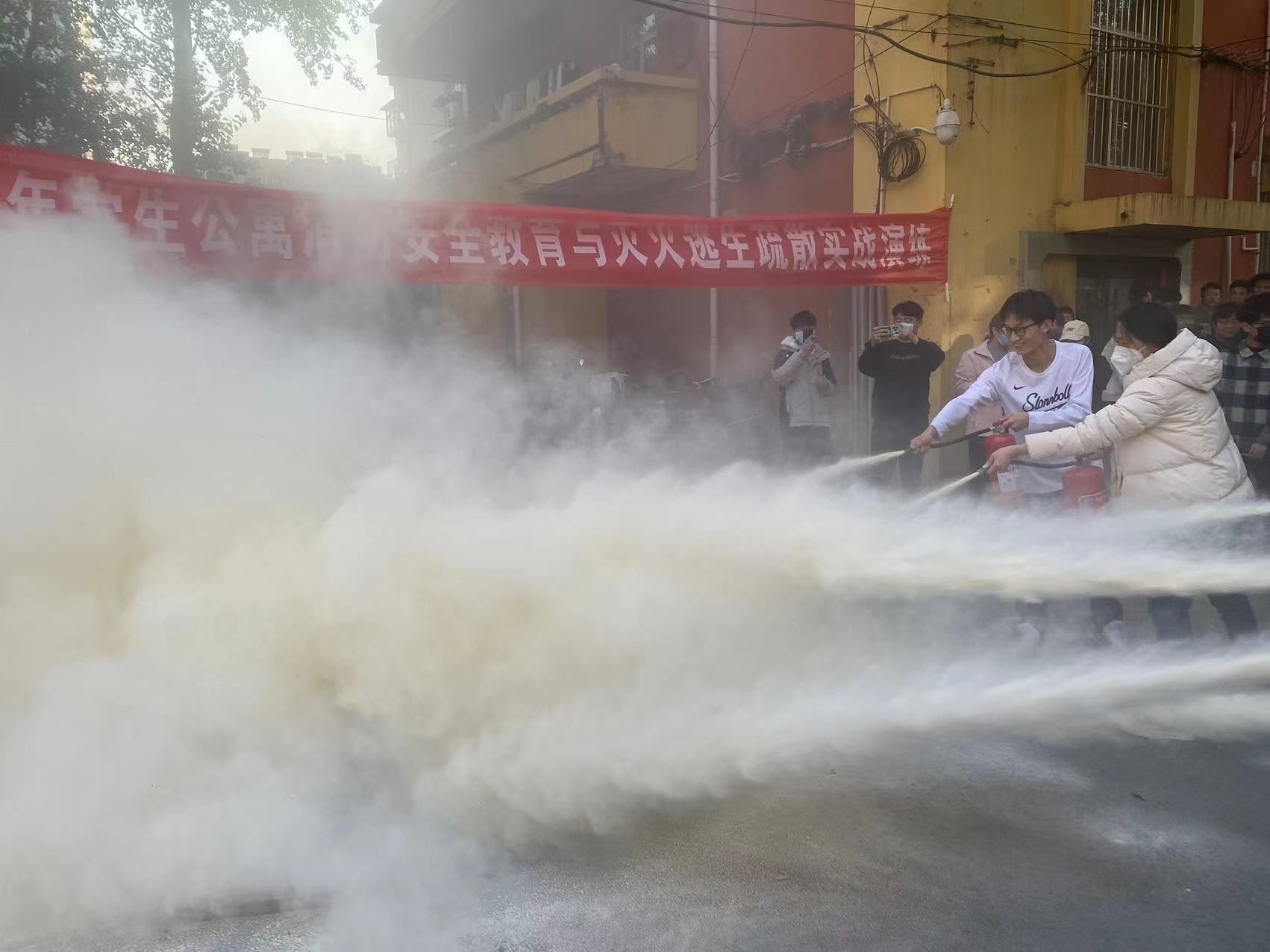 演练开始,工作人员释放模拟火情烟雾,演练现场顿时浓烟滚滚。消防值班人员发现火情后立即拉响警报,打开全部逃生门;值班辅导员立即到达公寓值守位置,有序组织疏散;参加演练的师生弯腰俯身、捂住口鼻,按照逃生指示安全撤离到室外集合地点。随后,参演师生们在消防管理科老师的指导下,分组进行了模拟灭火实战演练。