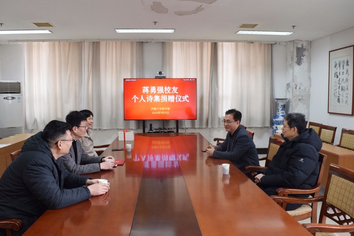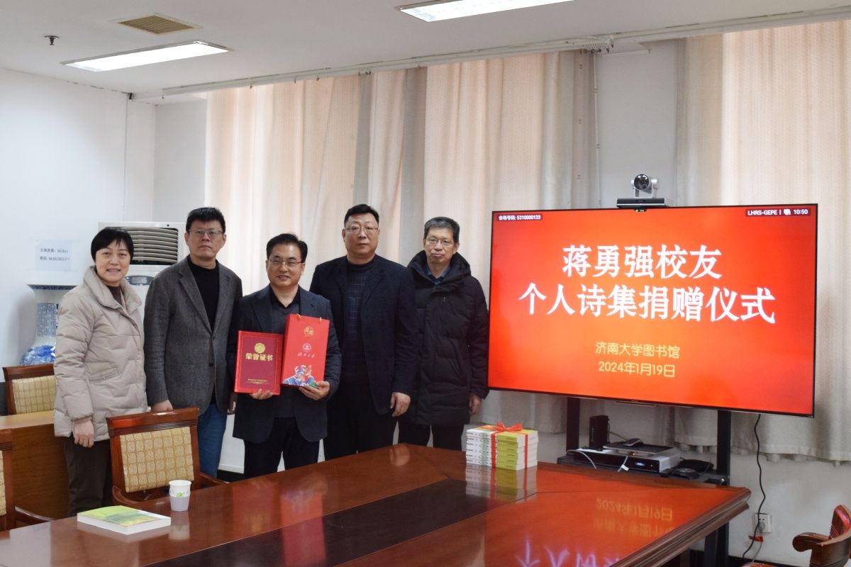 1月19日,土木建筑学院1988级工民建专业校友蒋勇强先生向母校图书馆及学院捐赠个人诗集《青的守望》各30册。sunbet申搏官方网站图书馆馆长王爱国、土木建筑学院党委书记李超、党委保卫部安全管理处副处长陈营明、土木建筑学院党委副书记朱小燕出席了捐赠仪式。