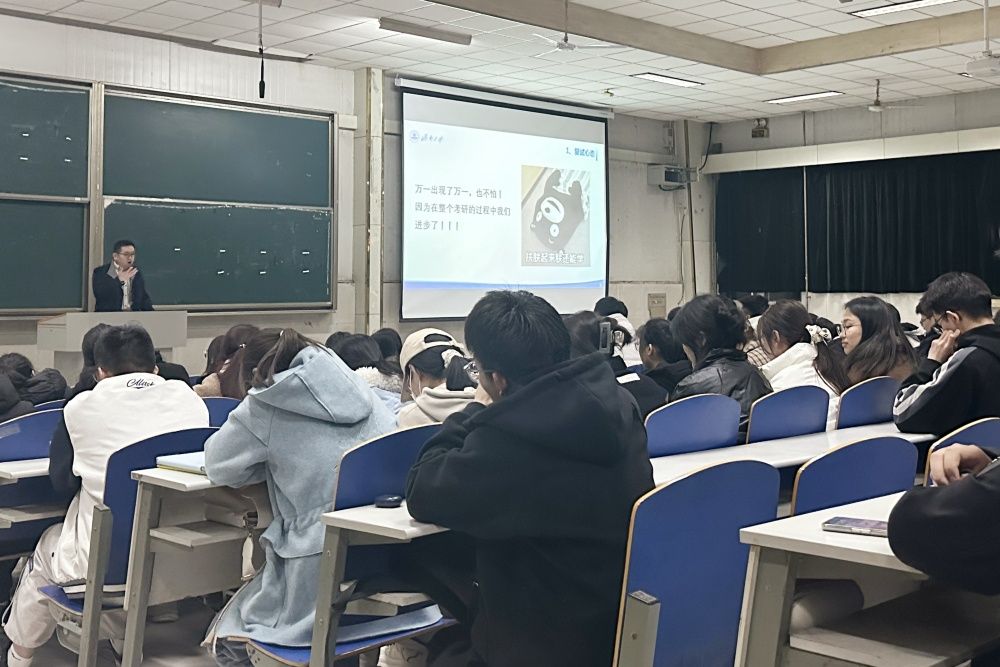 分享会上,李树人结合多年学生工作经验,从面试礼仪、复试流程、复试准备等方面为学生梳理详细备考技巧。李树人强调简历中应当突出优势、特点鲜明,建议同学们要充分熟悉简历中的各项细节内容,以便灵活应答面试现场。随后,他结合近几年研究生录取情况分析了今年的整体形势,向同学们分享有关调剂的流程和注意事项,建议同学们从多方面着手准备,充分获取信息,提高考研成功率。