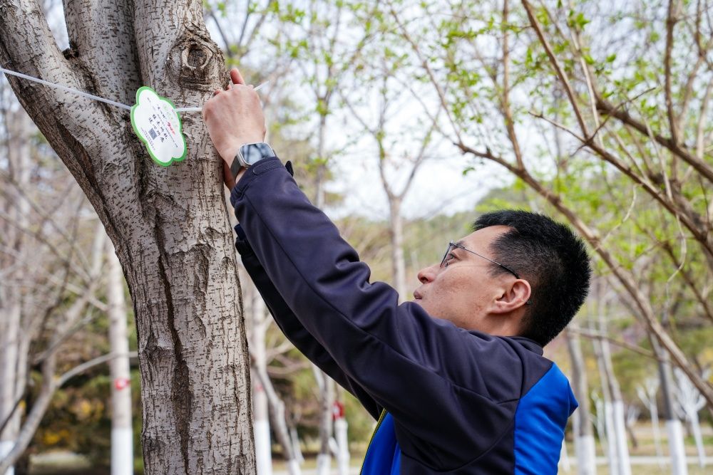 “校友爱心林”捐资认筹环节,校友们漫步在滋兰苑花海中,陈树奎、贾麦宁、刘锋等校友现场选取捐资认领树木,郑重地将铭牌挂到树上,值木所托、述心所愿,为母校送上祝福。