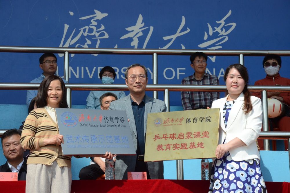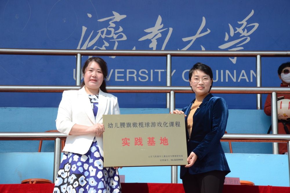 亓圣华分别为幼儿园乒乓球实践基地、附属小学武术实践基地授牌;王娜娜为幼儿园腰旗橄榄球实践基地授牌。