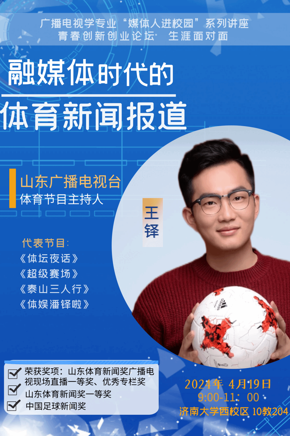 4月19日,主持人王铎结合自身职业生涯,从体育节目策划、现场报道技巧、语言表达能力、多元化技能等方面,为学生们带来一场精彩的知识盛宴。本次讲座不仅让学生明晰了体育节目的运作实践,也深刻理解了新媒体时代成为一名优秀媒体人的素养与能力。