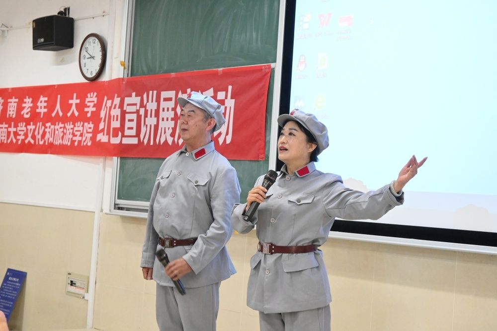随后,济南老年人大学宣讲团和文旅学院的学生们为大家带来了一场精彩的红色文化主题文艺汇演。此次文艺汇演以传承红色基因、弘扬爱国主义精神为主线,以诗歌朗诵、红色电影配音、红色歌曲等形式讲述了革命先烈的英勇事迹和党的奋斗历程,讴歌了党的丰功伟绩和取得的辉煌成就,大家声情并茂、气势磅礴,深情抒发了对党和祖国的真挚感情。诗朗诵《太阳的形象》《大写的中国》《谁是最可爱的人》《sunbet申搏的秋天》《可爱的中国》《军礼》《红色电影〈风暴〉台词》,红色歌曲《中华儿女》《老家在山东》《我和我的祖国》等一个个精彩节目,让在场的每一位观众都深受感动。