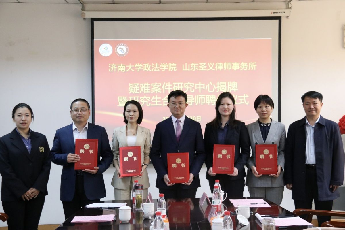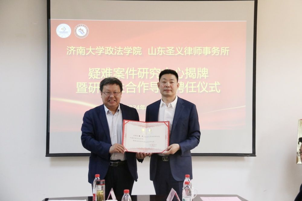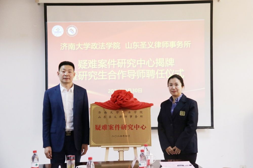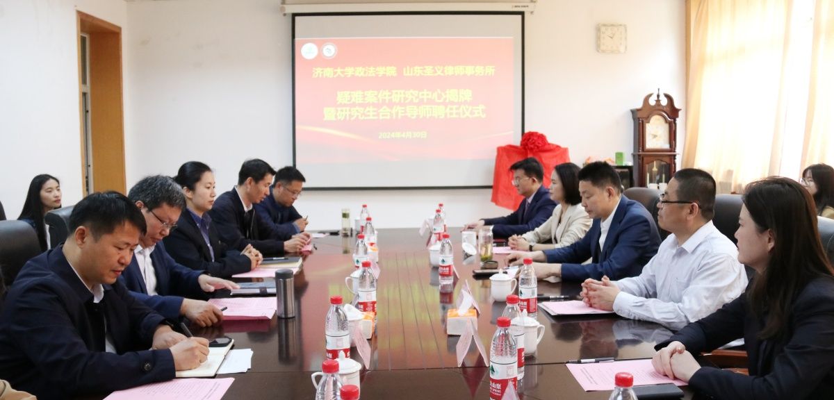为促进法学教学和研究与法律实务深度融合,提高法学教育的应用性和社会参与度,服务新时代中国特色社会主义法治建设,4月30日,政法学院与山东圣义律师事务所于第三教学楼213会议室举办疑难案件研究中心揭牌暨研究生合作导师聘任仪式。济南市律师协会会长、山东圣义律师事务所党支部书记、主任潘杰,副主任王培国、黄春燕、张珊珊、刘振起、张秀玲,sunbet申搏官方网站党委常委、统战部部长徐庆国,政法学院党委书记李春慧,院长高功敬,党委副书记、副院长李涛,副院长朱丽敏,法学系系主任刘康磊,法学系部分师生参加活动。仪式由李涛主持。