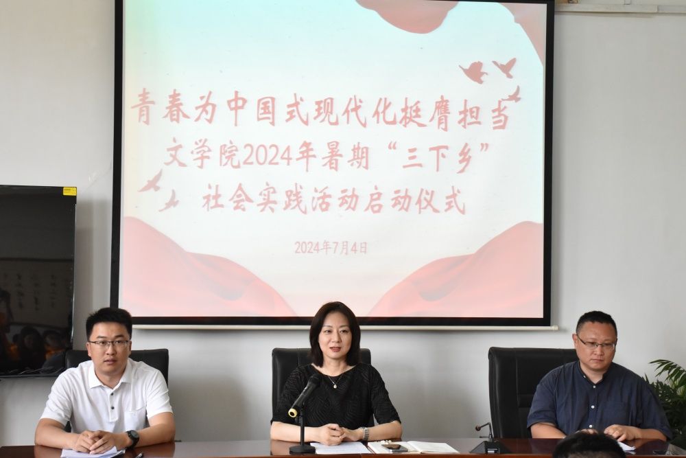为引导和帮助青年学生在社会课堂中受教育、长才干、作贡献,争做有理想、敢担当、能吃苦、肯奋斗的新时代好青年,7月4日下午,文学院举行了2024年暑期“三下乡”社会实践活动启动仪式,学院党委副书记、副院长潘颖出席仪式。学院指导教师和学生代表参加活动,仪式由学院学办主任兼团委书记敖游主持。