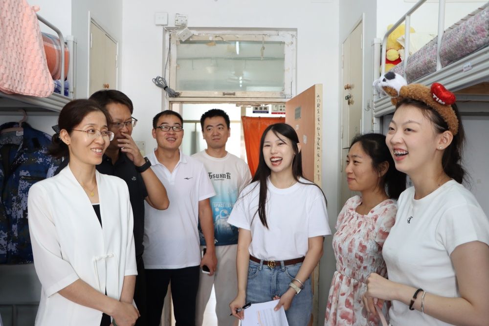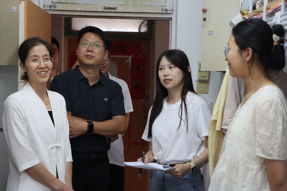 一行人逐一走访了本科生和研究生新生宿舍。郭英与新生们进行了亲切交谈,详细询问了同学们对宿舍和校园环境的适应情况,叮嘱同学们要在新环境中互相照顾、互相学习、互相督促,同时务必重视卫生及安全问题,并嘱咐同学们如有困难、有问题务必及时向辅导员们反映。