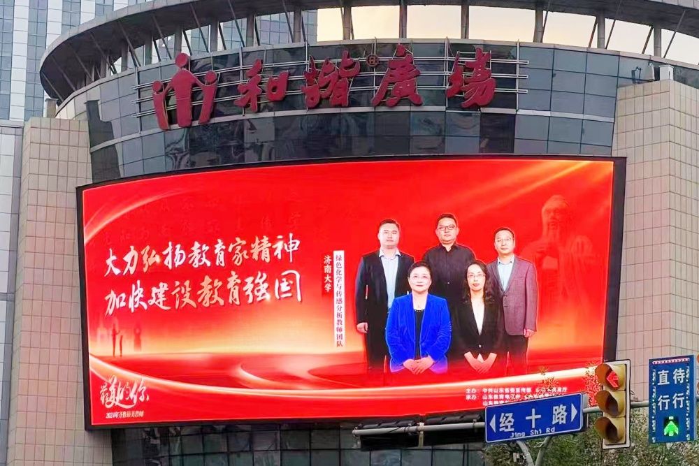 在和谐广场等大型建筑的电子屏幕上,我校刚刚荣获2024年“齐鲁最美教师”荣誉称号的绿色化学与传感分析教师团队精彩亮相。