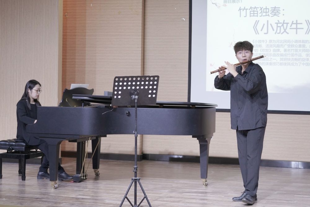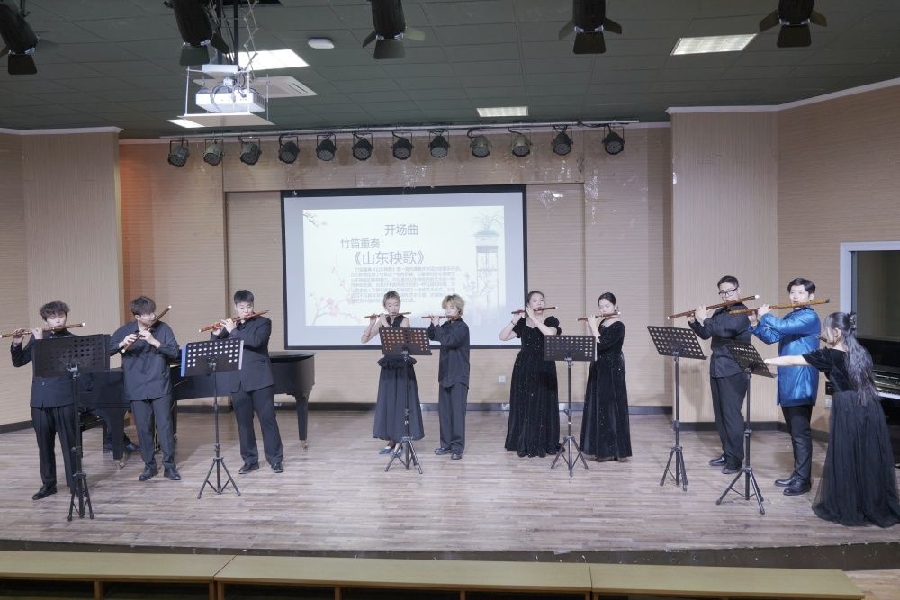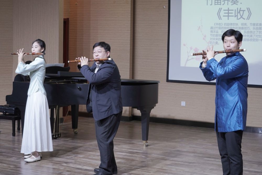 第二篇章则聚焦于“山东风情”,深入挖掘并呈现了山东这一齐鲁大地的独特魅力。通过一系列富有山东地方特色的笛子曲目,细腻描绘了山东的自然风光、民俗风情与历史文化,既展现了山东人民的热情豪迈与勤劳智慧,也传递了对这片土地深沉的爱恋与自豪。学生田欣禾演奏《凤阳歌绞八板》,融合“凤阳歌”与“八板”,为鲁西南鼓吹乐经典;刘锡钰带来《走进快活岭》,该作品为竹笛大师曲祥登泰山有感而创,表达了作者在泰山“快活岭”上忘却疲惫、心旷神怡的感受;李展副教授与学生共同齐奏《沂河欢歌》,展现了沂蒙山区的自然风光与欢快劳动场景,抒发了沂蒙儿女建设家乡的豪情与对美好未来的憧憬。最后,以齐奏《丰收》作为此次讲演会的完美收官之作,传达农民丰收的喜悦,不仅是对山东音乐文化的一次精彩演绎,更是对中华民族多元文化的一次深情致敬。