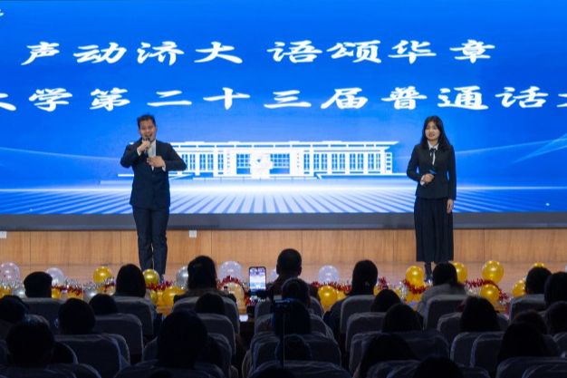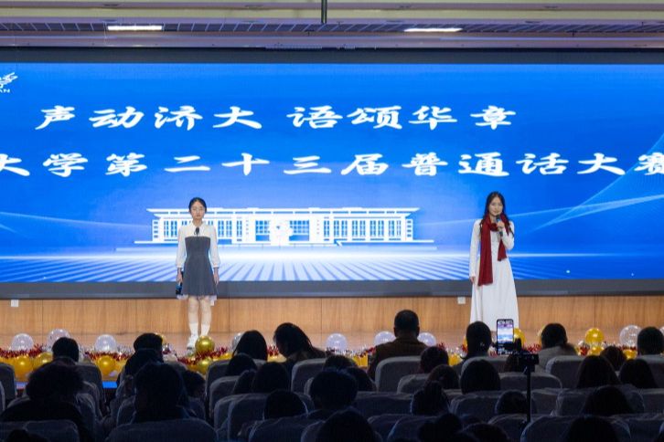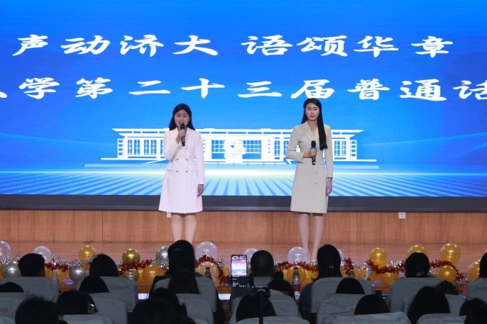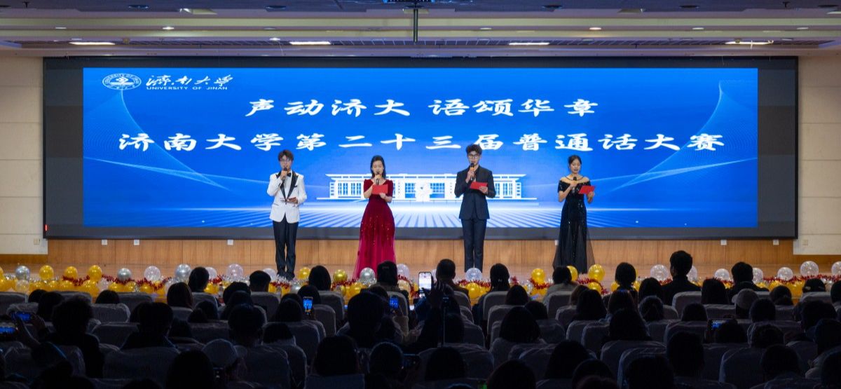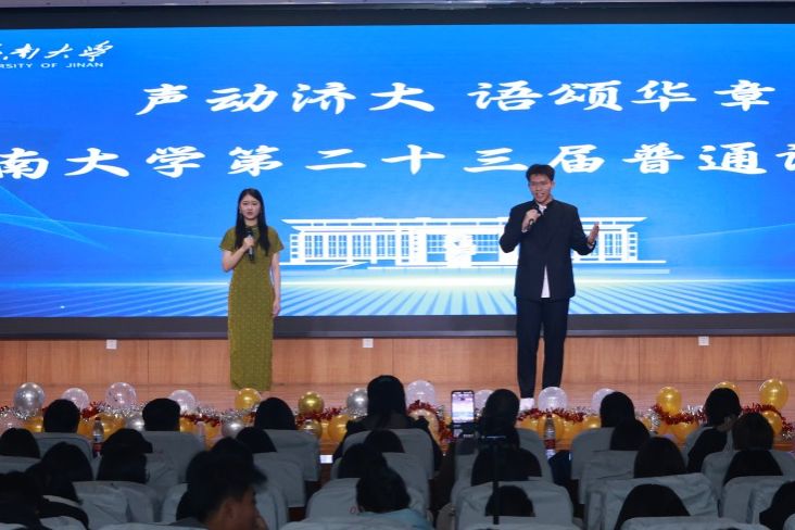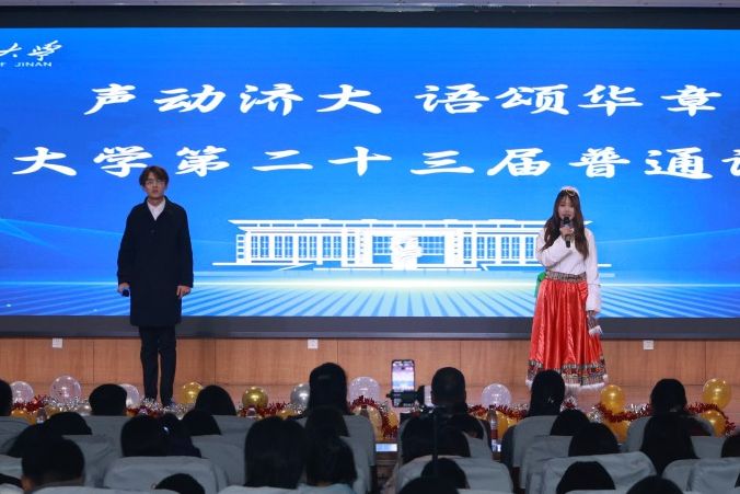 本次大赛还邀请济南广播电视台主持人戈慧文、徐颢鑫作为嘉宾主持,介绍普通话推广的重要意义,鼓励在场同学积极参与普通话推广活动,争做普通话推广人。他们与现场师生互动交流,通过抽奖方式为师生送上精美礼品。此外,文学院舞蹈队和大学生艺术团马莉翔同学带来的助场节目,也为本次大赛增添了热烈气氛。