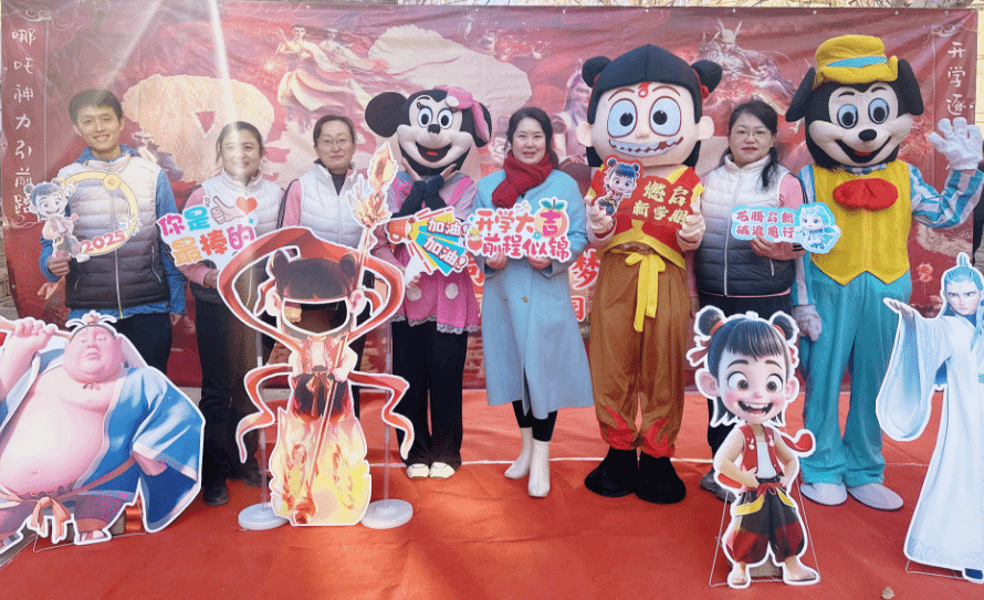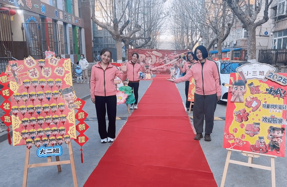 晨曦初照,朝阳倾洒下首缕金光,新学期的序章悠然开启。活动从幼儿园门口就开始了惊喜连连。长长的红毯两侧,摆放着哪吒造型的欢迎立牌,孩子们牵着家长的手穿过,仿佛步入了神话世界,开始了他们的新征程。老师们装扮成的哪吒等卡通人物热情迎接,与孩子们欢乐留念,老师们还送上新学期的第一份礼物,传递着幼儿园“爱的教育”的主题信念,温暖与关怀在每一个细节中流淌。