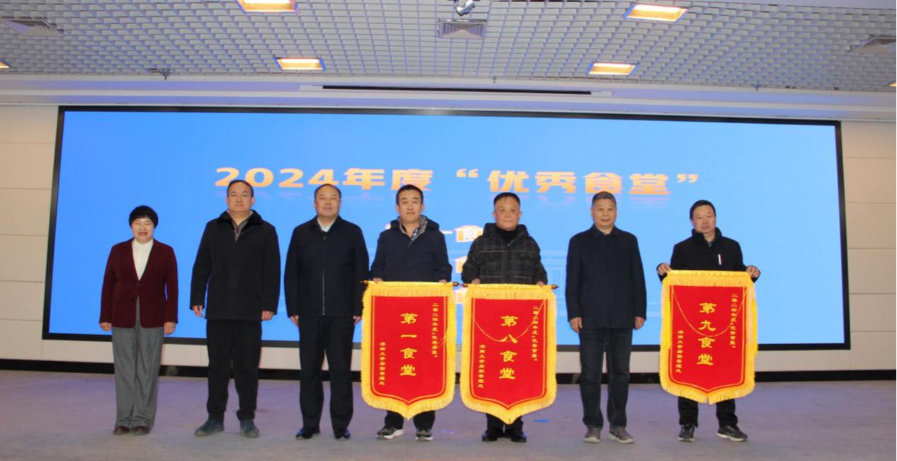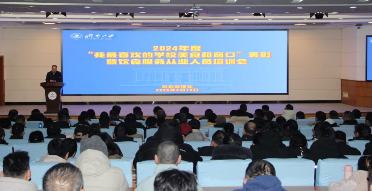 栾志强宣读了2024年度“我最喜欢的学校美食和窗口”评选活动获奖名单,活动通过线上线下评选和领导小组评定等方式,共表彰优秀食堂3个,十佳美食10个,师生喜爱菜品74个,师生满意窗口43个。饮食工作责任重大,使命光荣,全体饮食服务人员在新的一年里定将再接再厉,从严从实抓好食品安全工作,用心用情服务校园师生。