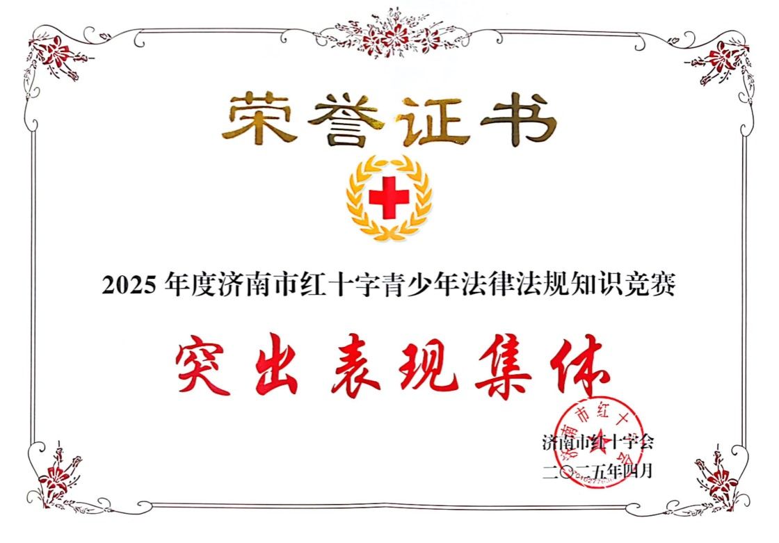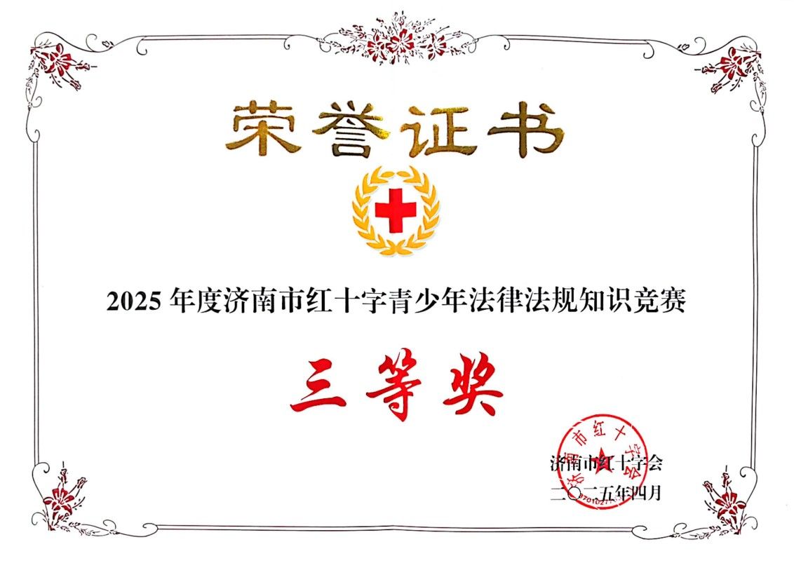 近日,由济南市红十字会主办的2025年济南市红十字青少年法律法规知识竞赛落下帷幕,我校王迪睿、刘馨逸、张涛三位同学组成的参赛队荣获三等奖,学校荣获突出表现集体称号。