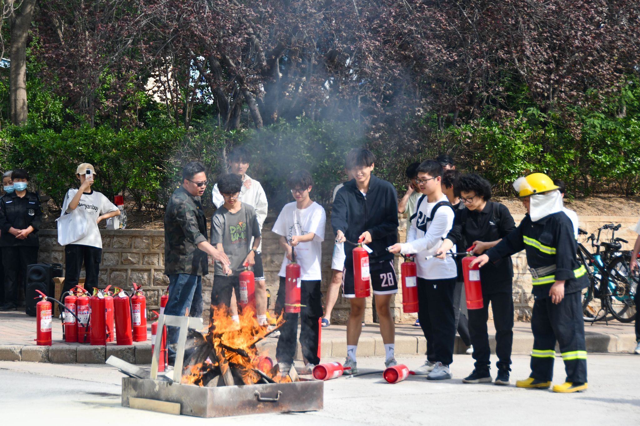 在随后的实战灭火环节,保卫部消防科李鹏老师现场演示了干粉灭火器“提、拔、握、压”四步操作法,并指导师生代表对模拟火源进行有效灭火处置。党委保卫部部长李荣光强调:“宿舍安全‘三严禁’必须落到实处,即严禁私拉乱接电线、严禁违规使用大功率电器、严禁遮挡消防设施。”物业服务人员同步建立隐患整改台账,对演练中暴露的疏散标识老化问题立行立改。