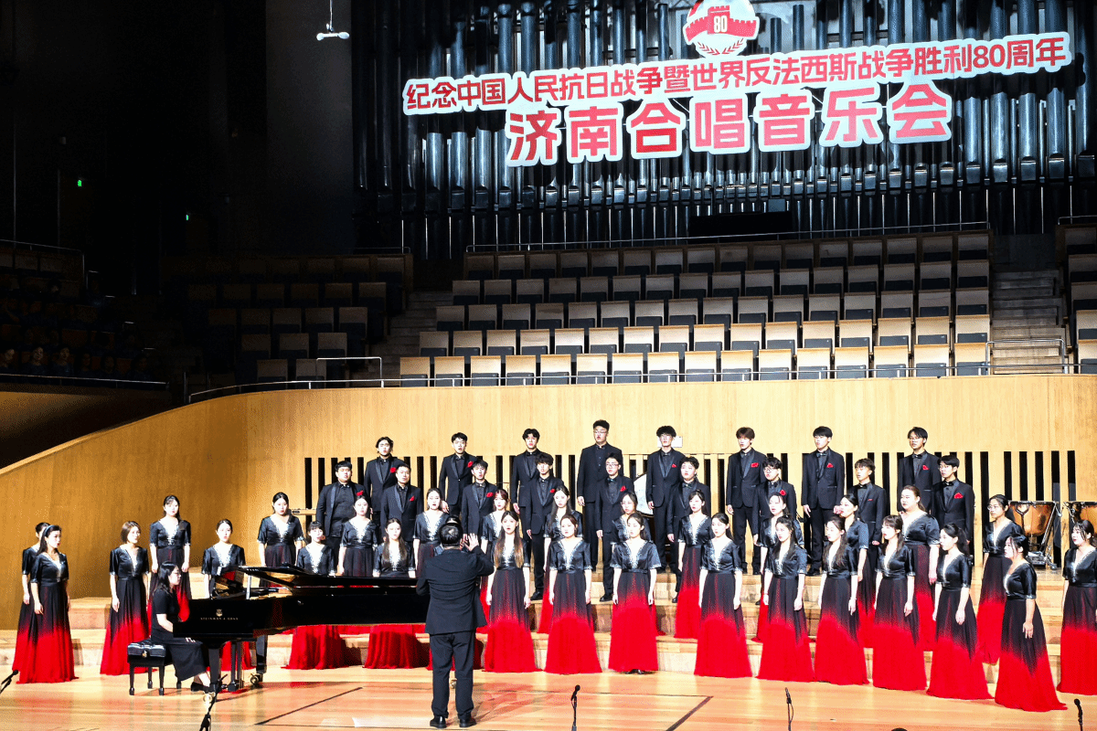 为纪念中国人民抗日战争暨世界反法西斯战争胜利80周年,8月30日,“铭记历史 珍爱和平”济南合唱音乐会隆重举行。本次活动由中共济南市委宣传部、济南市文学艺术界联合会、济南日报报业集团、济南市教育局、济南市文化和旅游局、济南广播电视台联合主办,济南市文艺创作研究院、济南市音乐家协会、山东省会大剧院协办,旨在通过音乐艺术形式回顾历史、弘扬伟大爱国主义精神。我校音乐学院合唱团应邀参加了演出活动。
