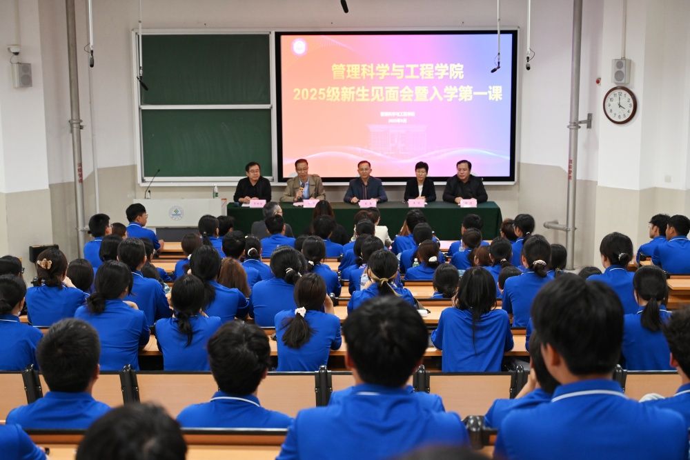 为帮助新生尽快融入新阶段的学习和生活,9月22日,管理科学与工程学院在舜耕校区举办2025级新生见面会暨入学第一课。学院领导、全体辅导员、新生班主任、在校生代表及2025 级全体新生参加,见面会由学院党委副书记、副院长郭华主持。