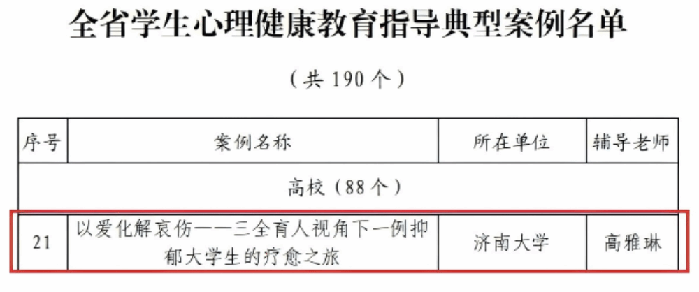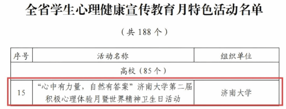 近日,山东省教育厅公布了2025年山东省学生心理健康宣传教育月系列活动获奖名单,我校申报的《“心中有力量,自然有答案”第二届积极心理体验月暨世界精神卫生日活动》入选全省学生心理健康宣传教育月特色活动,心理指导中心高雅琳撰写的《以爱化解哀伤——三全育人视角下一例抑郁大学生的疗愈之旅》入选全省学生心理健康教育指导典型案例名单,充分展现了我校在心理健康教育领域的扎实工作与创新成果。
