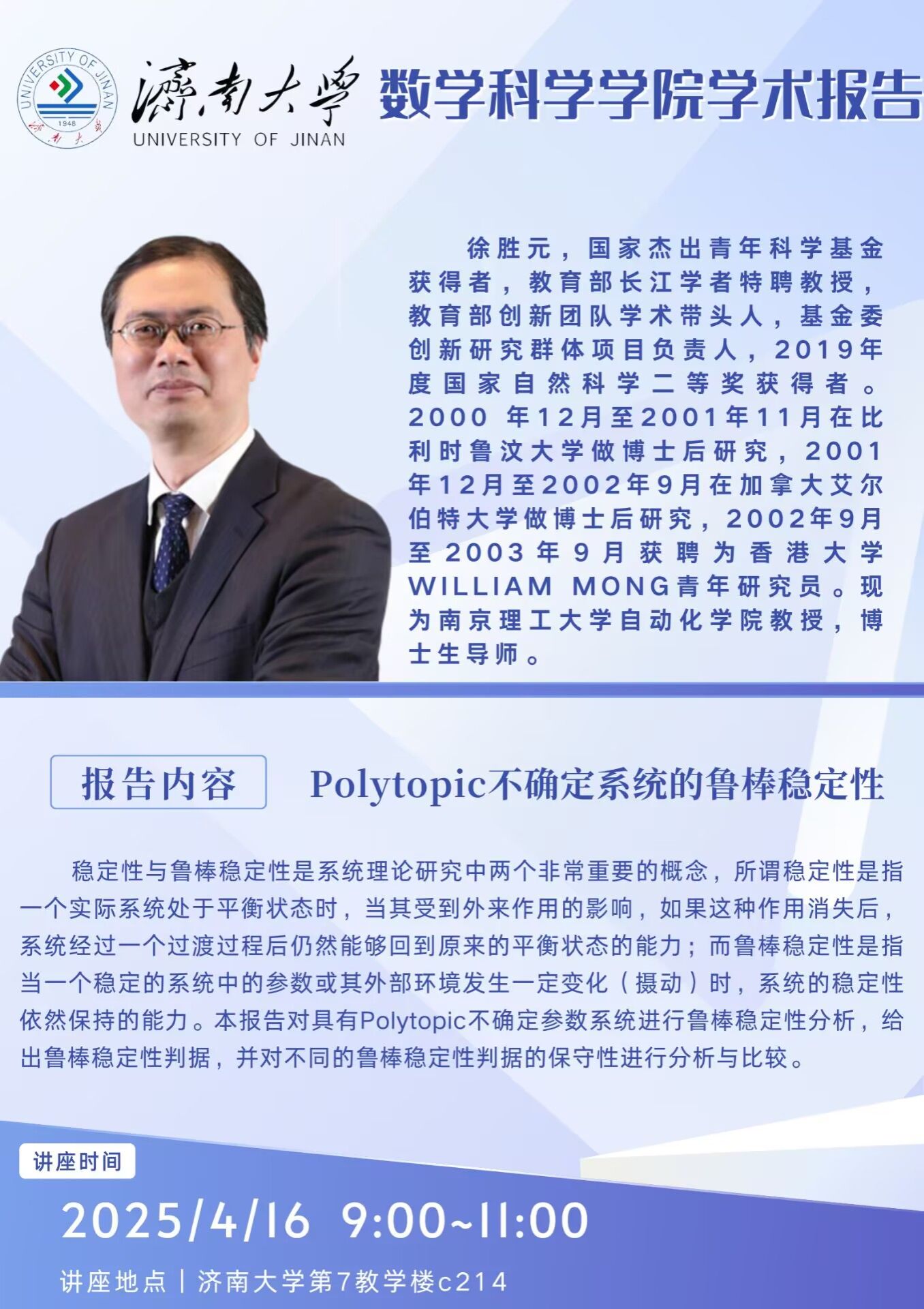 数学科学学院学术报告:Polytopic不确定系统的鲁棒稳定性
