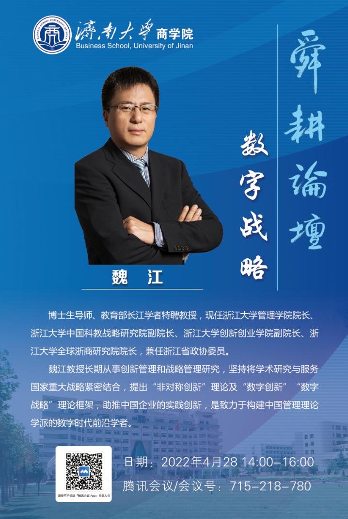 魏江教授长期从事创新管理和战略管理研究,坚持将学术研究与服务国家重大战略紧密结合,提出“非对称创新”理论及“数字创新”“数字战略”理论框架,助推中国企业的实践创新,是致力于构建中国管理理论学派的数字时代前沿学者。本次讲座魏江教授将围绕“什么是数字战略、数字战略是否重构了战略管理的核心逻辑、如何实现数字战略”这三个问题展开讲解。