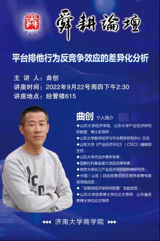 商学院邀请山东大学经济学院、山东大学产业经济研究所教授、博士生导师曲创教授做客舜耕论坛。曲教授针对近年来层出不穷的平台“二选一”现象进行深入剖析,探讨平台排他行为反竞争效应的差异化。